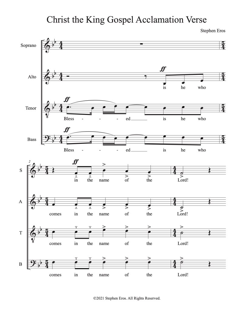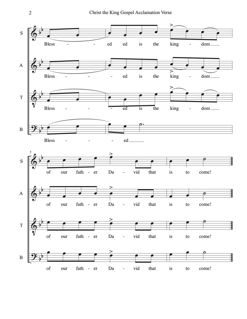 Since writing the Lenten Gospel Acclamation set, I have composed simple choral verses for nearly every liturgy for which the St. Clare of Assisi Choir sings, and for all three lectionary cycles. They are paired with pre-existing refrains, mainly from the GIA catalogue. I have included a few samples below. Please reach out if you are interested in obtaining copies of these for use in your parish.