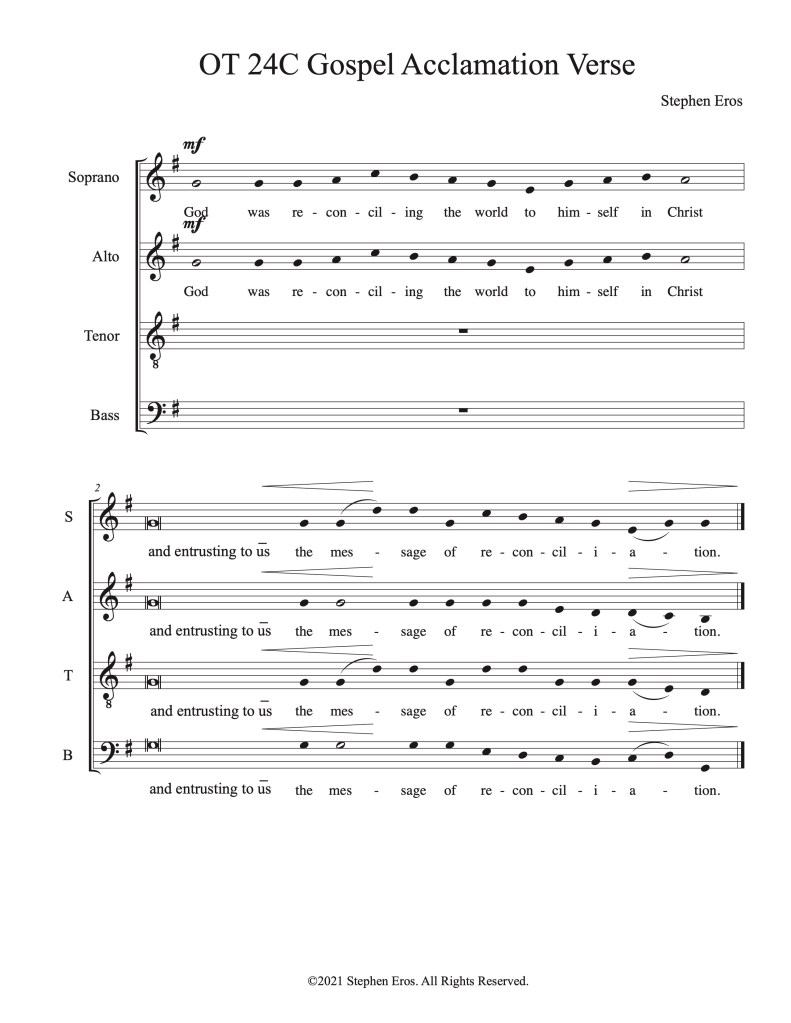 During Lent of 2021, my church choir was divided into several small groups, which allowed for appropriate safe spacing. With limited forces, the repertoire we were able to pull off was also limited. I began composing choral gospel acclamation verses to challenge the singers and enhance the offerings we were able to bring to the liturgy. The result a couple years later was a published set of choral verses for all three lectionary cycles and Holy Week. Click here to view the publisher’s website, and hopefully buy many copies!